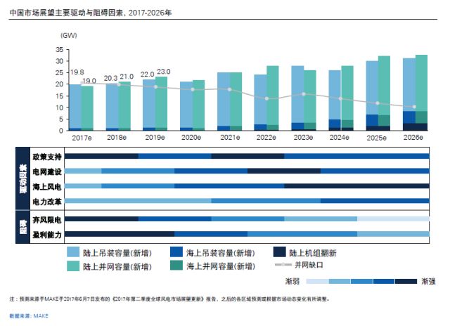 風(fēng)電并網(wǎng)缺口逐年減少,預(yù)計(jì)將從2017年的20.3GW縮減到2026年的10.1GW。 2020年以后,海上風(fēng)電將進(jìn)入快速發(fā)展期,并于2026年達(dá)到當(dāng)年新增并網(wǎng)容量的16.0%。風(fēng)電機(jī)組翻新市場將成為未來風(fēng)電發(fā)展重心之一。